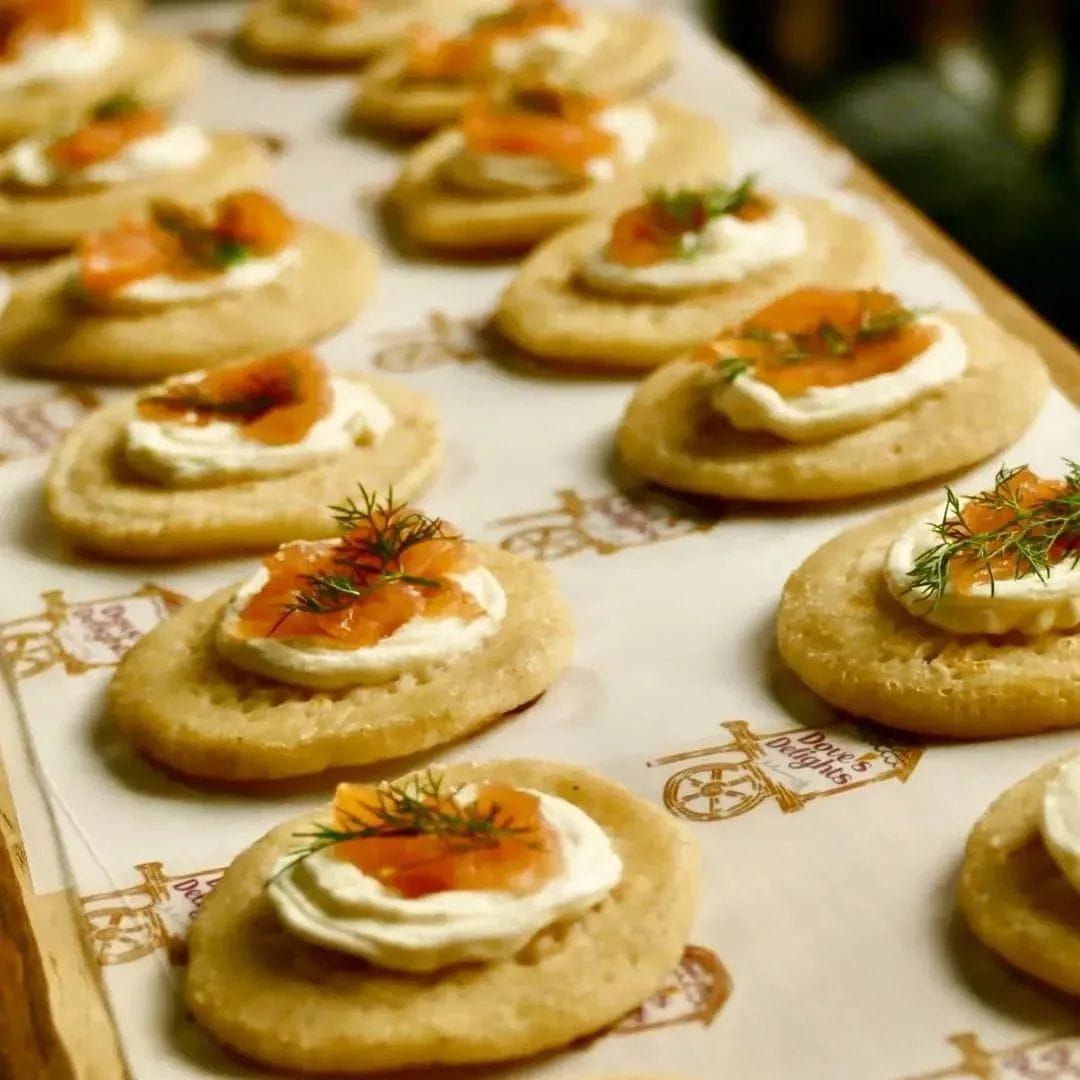 - Smoked salmon & cream cheese blinis with a dill garnish