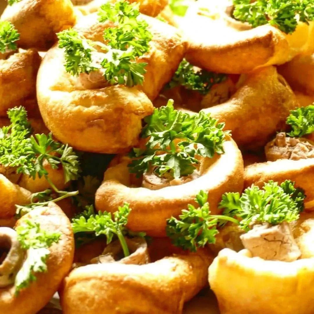 - Mini Yorkshire puds filled with horseradish sauce and topside of beef with a parsley garnish